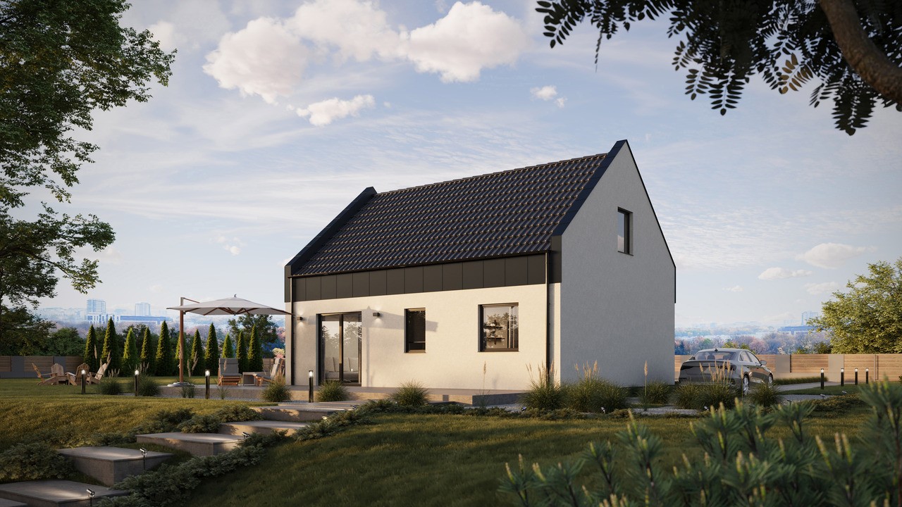 Projekt ERDOL 2 PLUS w wybranej konfiguracji posiada dach dwuspadowy nowoczesny z poddaszem użytkowym oraz wyposażony jest w stolarkę PVC firmy EUROCOLOR SYNEGO na profilu marki REHAU o szerokości 80mm w obustronnym kolorze antracytowym.