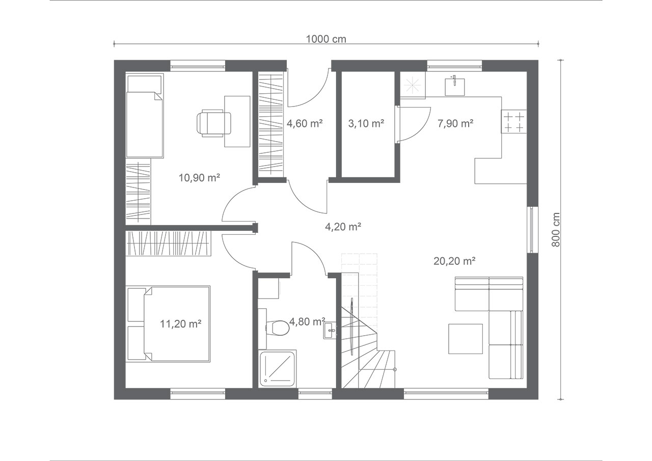 Dom ERDOL 2 PLUS ma powierzchnię po podłodze: 127 m² w rozkładzie: 68 m² na parterze oraz 59 m² na piętrze. Jest to początek nowej linii domów ERDOL HAUS, która charakteryzuje się nowoczesną bryłą oraz wstępnym wykończeniem budynku już w stanie surowym zamkniętym.