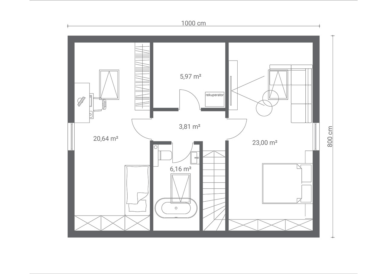 - Instalacje wewnętrzne: elektryczna, wod. kan., ogrzewanie, wentylacja mechaniczna (rekuperacja).