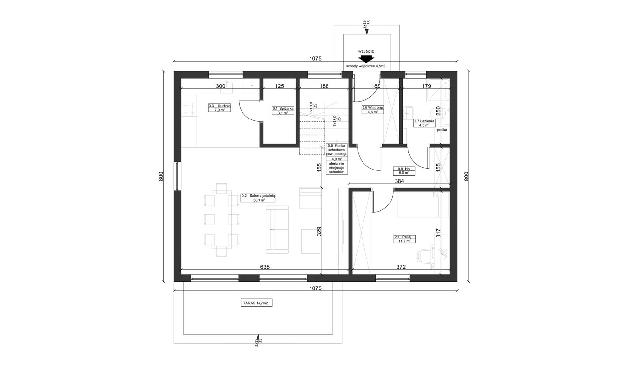 ERDOL 1 XL to powiększona wersja naszego bazowego projektu. Dom ten ma powierzchnię 74 m² (116 m² jeśli wybrana zostanie wersja z poddaszem użytkowym) i oferuje swoim mieszkańcom dobrze przemyślaną przestrzeń na kompaktowej powierzchni. Dzięki stosunkowo niewielkim rozmiarom ERDOL 1 XL jest domem tanim w utrzymaniu i wygodnym w codziennym funkcjonowaniu. Do jego stworzenia wykorzystaliśmy najwyższej jakości drewno KVH oraz energooszczędne rozwiązania i systemy, które sprawiają, że budynek jest przyjazny dla środowiska. Jeśli poszukujesz domu, który zapewni Ci komfort i pozwoli na oszczędności, ten model to doskonały wybór.