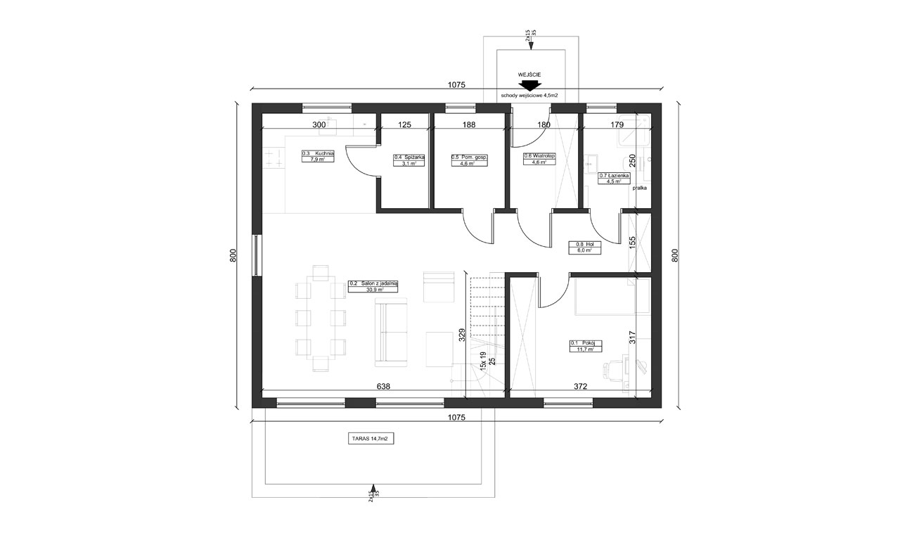 ERDOL 1 XL to powiększona wersja naszego bazowego projektu. Dom ten ma powierzchnię 74 m² (116 m² jeśli wybrana zostanie wersja z poddaszem użytkowym) i oferuje swoim mieszkańcom dobrze przemyślaną przestrzeń na kompaktowej powierzchni. Dzięki stosunkowo niewielkim rozmiarom ERDOL 1 XL jest domem tanim w utrzymaniu i wygodnym w codziennym funkcjonowaniu. Do jego stworzenia wykorzystaliśmy najwyższej jakości drewno KVH oraz energooszczędne rozwiązania i systemy, które sprawiają, że budynek jest przyjazny dla środowiska. Jeśli poszukujesz domu, który zapewni Ci komfort i pozwoli na oszczędności, ten model to doskonały wybór.