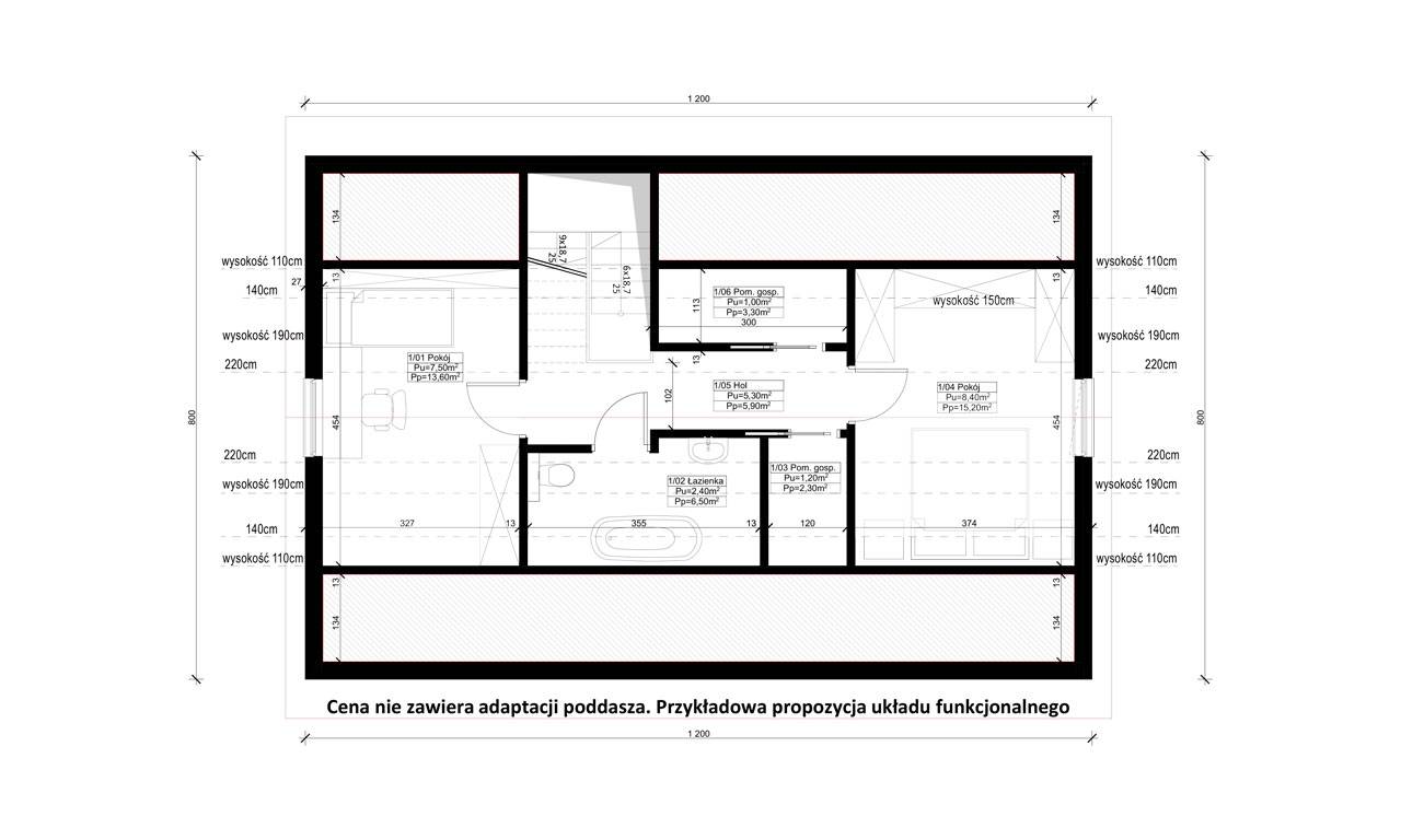 12. Zagospodarowanie i aranżacja poddasza, tj. wykonanie wentylacji poddasza, wykonanie podłogi, ścian działowych, sufitów i skosów, rozprowadzenie instalacji elektrycznej oraz wodno-kanalizacyjnej