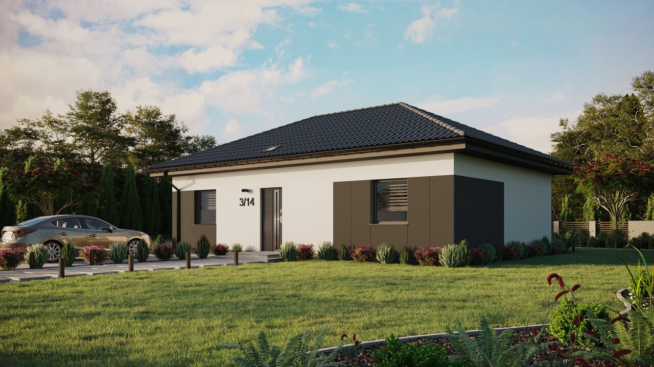 Projekt ERDOL 2 XL w wybranej konfiguracji posiada dach czterospadowy bez poddasza użytkowego o kącie nachylenia 25 stopni oraz wyposażony jest w stolarkę PVC firmy EUROCOLOR SYNEGO na profilu marki REHAU o szerokości 80mm w kolorze antracytowym.