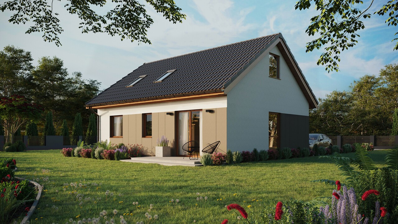 Projekt ERDOL 2 w wybranej konfiguracji posiada dach dwuspadowy z poddaszem użytkowym o kącie nachylenia 35 stopni oraz wyposażony jest w stolarkę PVC firmy EUROCOLOR SYNEGO na profilu marki REHAU o szerokości 80mm w kolorze złoty dąb.