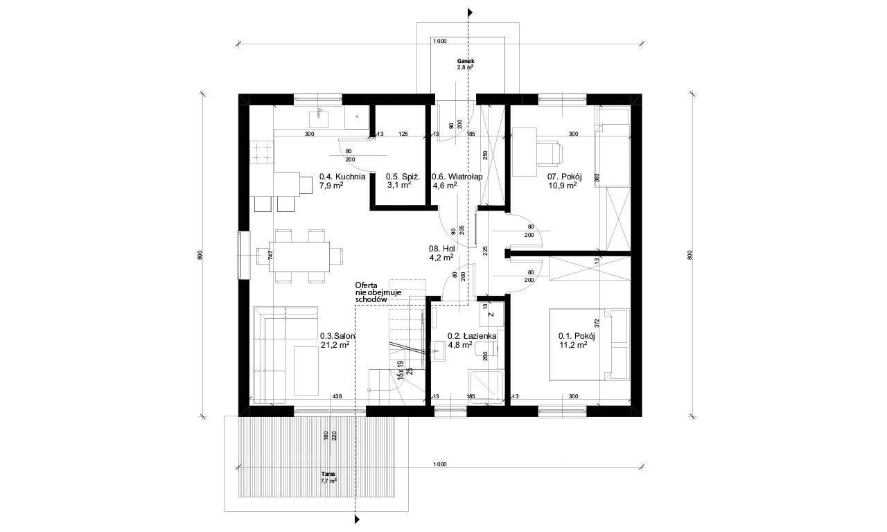 Istnieje możliwość wykorzystania spiżarni jako pomieszczenie techniczne z wejściem od strony wiatrołapu – wszystkie nasze budynki mają w ścianie od strony wiatrołapu przygotowane miejsce montażu drzwi, które można wstawić po usunięciu płyt zamykających przejście.