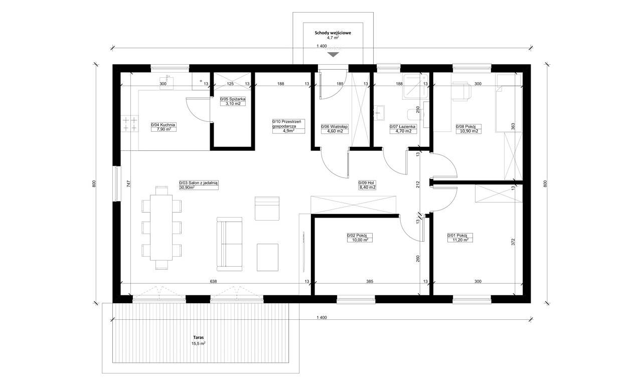 Projekt domu ERDOL 3 XL o powierzchni 97 m² (151 m² w wersji z poddaszem użytkowym) to projekt dla osób, które pragną mieć więcej wygodnej przestrzeni na co dzień. Dom w tej wersji to wydłużony ERDOL 3, dzięki czemu udało się zwiększyć powierzchnię salonu oraz wygospodarować osobną klatkę schodową (dla wersji z poddaszem użytkowym) lub dodatkowe pomieszczenie gospodarcze (dla wersji bez poddasza użytkowego). Jeśli zależy Ci na większym metrażu, ten projekt jest idealny dla Ciebie. Zastosowane w nim nowoczesne technologie i ekologiczne rozwiązania, sprawiają, że jest to dom energooszczędny, który funkcjonuje w harmonii z naturą. Do budowy wykorzystuje się drewno KVH stanowiące podstawę całej konstrukcji. Odpowiednio dobrane materiały izolacyjne sprawiają, że dom chroniony jest przed stratami ciepła.