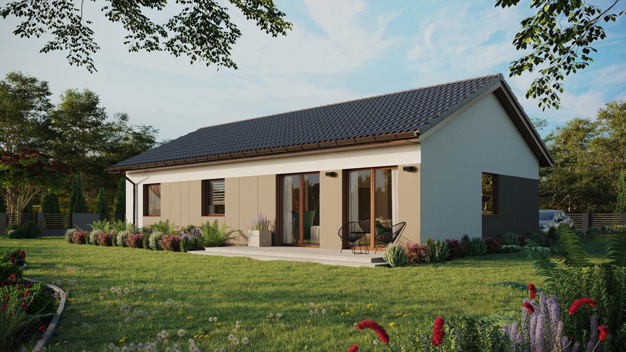 Projekt ERDOL 3 XL w wybranej konfiguracji posiada dach dwuspadowy bez poddasza użytkowego o kącie nachylenia 25 stopni oraz wyposażony jest w stolarkę PVC firmy EUROCOLOR SYNEGO na profilu marki REHAU o szerokości 80mm w kolorze orzech.