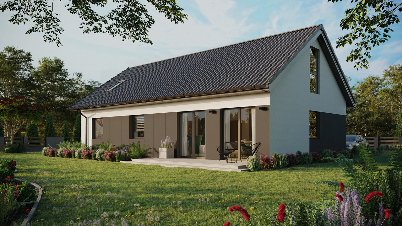 Projekt ERDOL 3 XL w wybranej konfiguracji posiada dach dwuspadowy z poddaszem użytkowym o kącie nachylenia 35 stopni oraz wyposażony jest w stolarkę PVC firmy EUROCOLOR SYNEGO na profilu marki REHAU o szerokości 80mm w kolorze antracytowym.