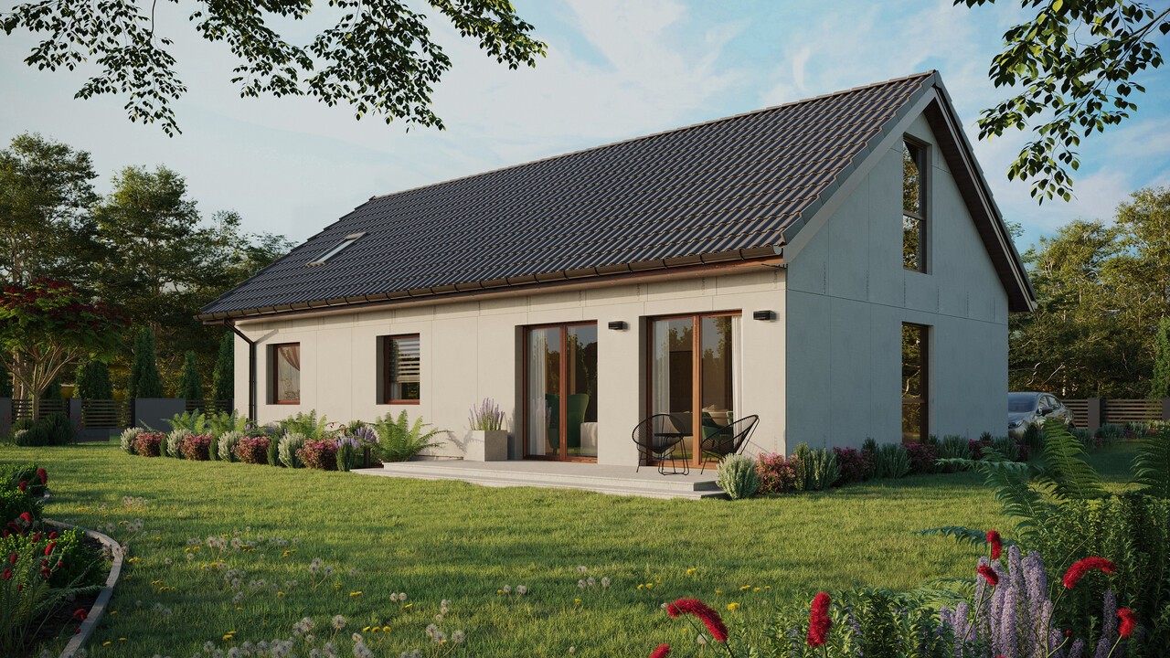 Projekt ERDOL 3 XL w wybranej konfiguracji posiada dach dwuspadowy z poddaszem użytkowym o kącie nachylenia 35 stopni oraz wyposażony jest w stolarkę PVC firmy EUROCOLOR SYNEGO na profilu marki REHAU o szerokości 80mm w kolorze orzech.