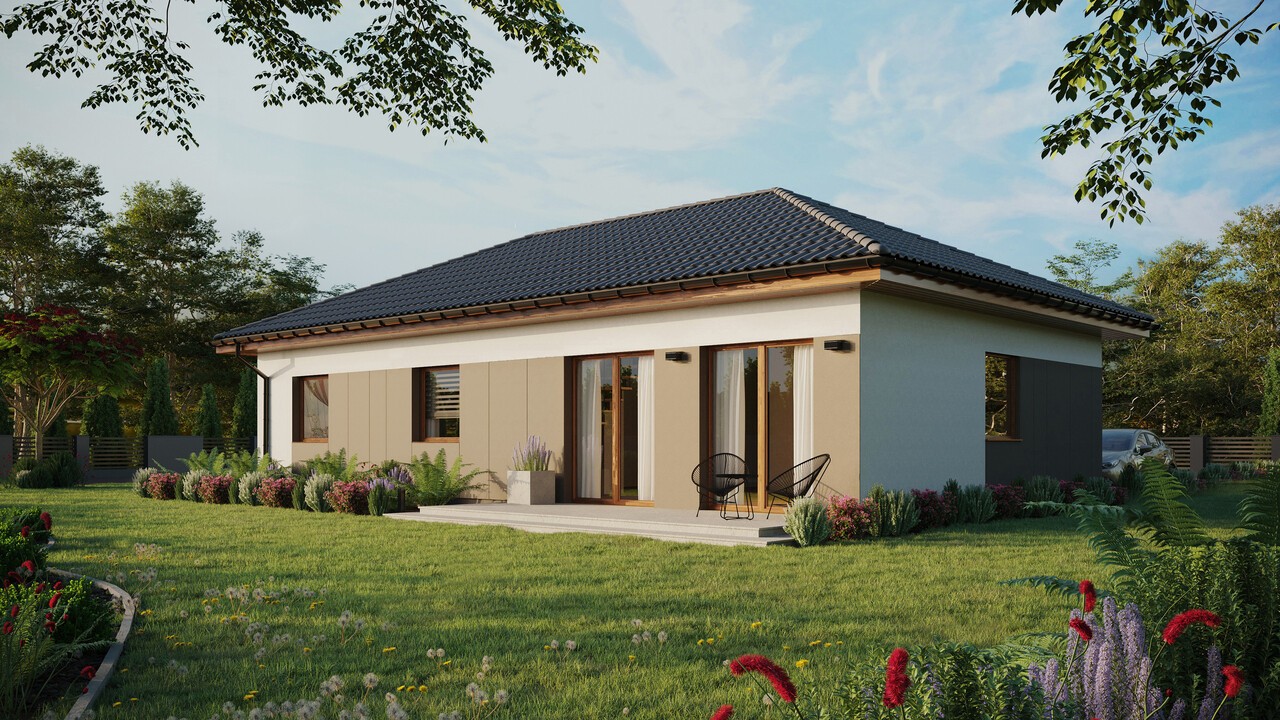 Projekt ERDOL 3 XL w wybranej konfiguracji posiada dach czterospadowy bez poddasza użytkowego o kącie nachylenia 25 stopni oraz wyposażony jest w stolarkę PVC firmy EUROCOLOR SYNEGO na profilu marki REHAU o szerokości 80mm w kolorze złoty dąb.