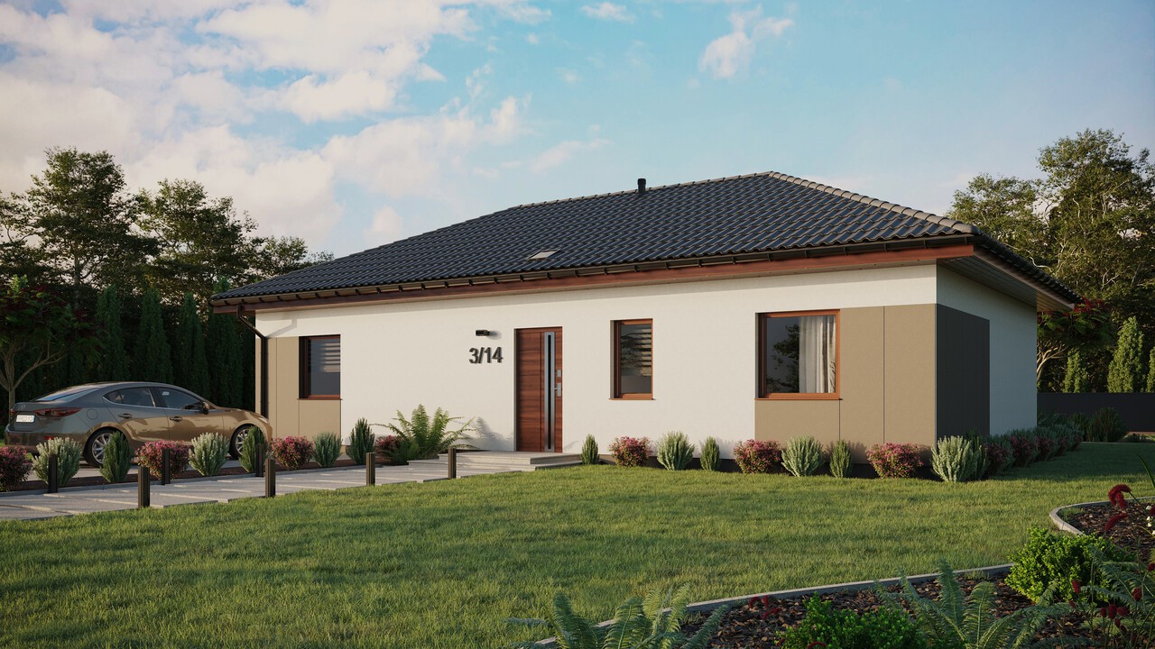 Projekt ERDOL 3 XL w wybranej konfiguracji posiada dach czterospadowy bez poddasza użytkowego o kącie nachylenia 25 stopni oraz wyposażony jest w stolarkę PVC firmy EUROCOLOR SYNEGO na profilu marki REHAU o szerokości 80mm w kolorze orzech.
