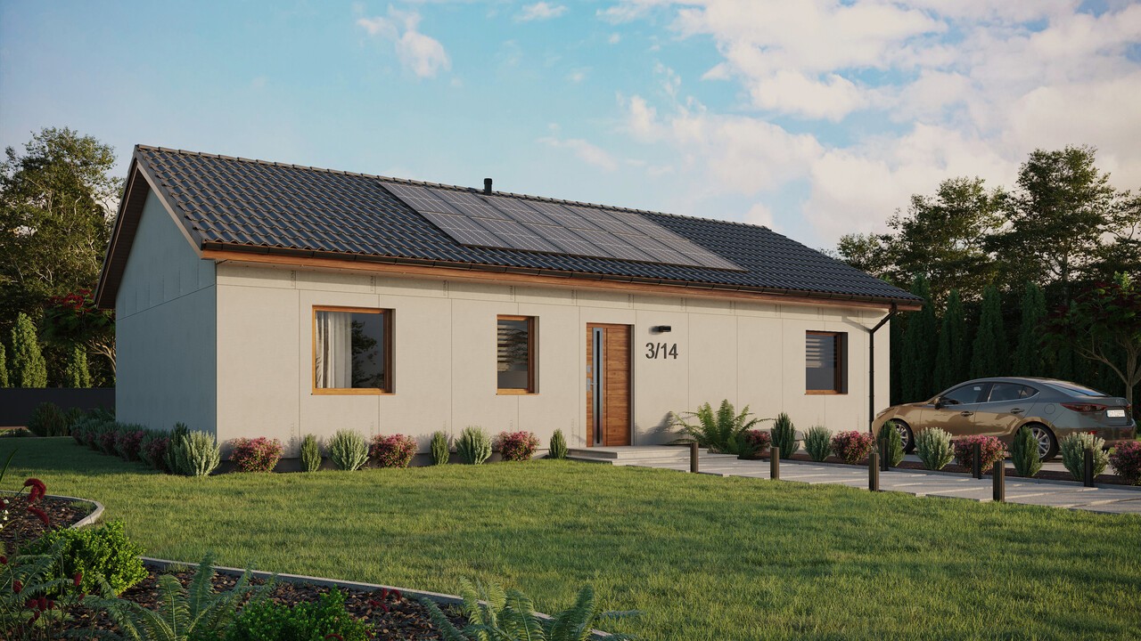 Projekt domu ERDOL 3 XL o powierzchni 97 m² (151 m² w wersji z poddaszem użytkowym) to projekt dla osób, które pragną mieć więcej wygodnej przestrzeni na co dzień. Dom w tej wersji to wydłużony ERDOL 3, dzięki czemu udało się zwiększyć powierzchnię salonu oraz wygospodarować osobną klatkę schodową (dla wersji z poddaszem użytkowym) lub dodatkowe pomieszczenie gospodarcze (dla wersji bez poddasza użytkowego). Jeśli zależy Ci na większym metrażu, ten projekt jest idealny dla Ciebie. Zastosowane w nim nowoczesne technologie i ekologiczne rozwiązania, sprawiają, że jest to dom energooszczędny, który funkcjonuje w harmonii z naturą. Do budowy wykorzystuje się drewno KVH stanowiące podstawę całej konstrukcji. Odpowiednio dobrane materiały izolacyjne sprawiają, że dom chroniony jest przed stratami ciepła.
