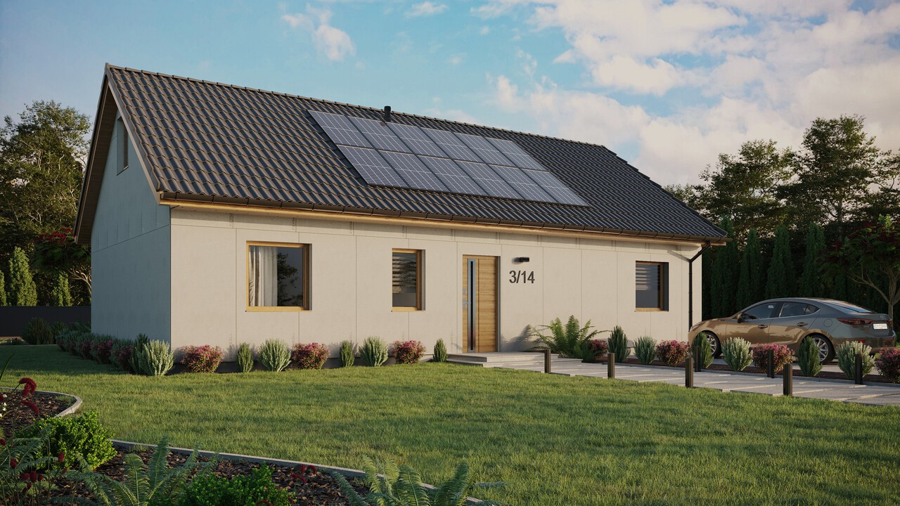 Projekt domu ERDOL 3 XL o powierzchni 97 m² (151 m² w wersji z poddaszem użytkowym) to projekt dla osób, które pragną mieć więcej wygodnej przestrzeni na co dzień. Dom w tej wersji to wydłużony ERDOL 3, dzięki czemu udało się zwiększyć powierzchnię salonu oraz wygospodarować osobną klatkę schodową (dla wersji z poddaszem użytkowym) lub dodatkowe pomieszczenie gospodarcze (dla wersji bez poddasza użytkowego). Jeśli zależy Ci na większym metrażu, ten projekt jest idealny dla Ciebie. Zastosowane w nim nowoczesne technologie i ekologiczne rozwiązania, sprawiają, że jest to dom energooszczędny, który funkcjonuje w harmonii z naturą. Do budowy wykorzystuje się drewno KVH stanowiące podstawę całej konstrukcji. Odpowiednio dobrane materiały izolacyjne sprawiają, że dom chroniony jest przed stratami ciepła.