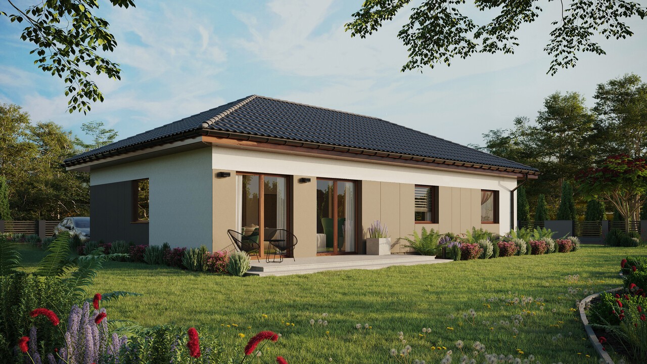 Projekt ERDOL 3 XL w wybranej konfiguracji posiada dach czterospadowy bez poddasza użytkowego o kącie nachylenia 25 stopni oraz wyposażony jest w stolarkę PVC firmy EUROCOLOR SYNEGO na profilu marki REHAU o szerokości 80mm w kolorze orzech.