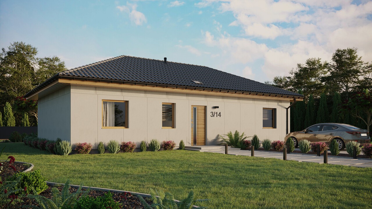 Projekt ERDOL 3 XL w wybranej konfiguracji posiada dach czterospadowy bez poddasza użytkowego o kącie nachylenia 25 stopni oraz wyposażony jest w stolarkę PVC firmy EUROCOLOR SYNEGO na profilu marki REHAU o szerokości 80mm w kolorze winchester.