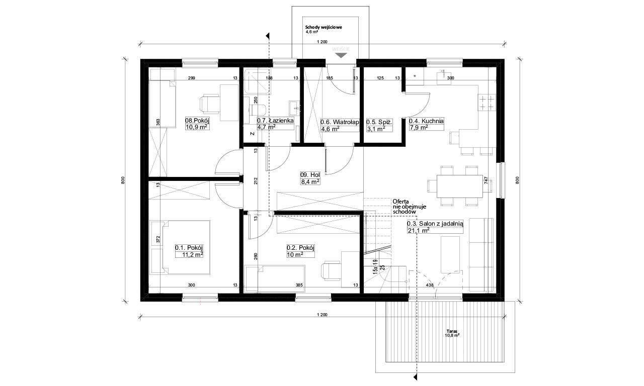 Istnieje możliwość wykorzystania spiżarni jako pomieszczenie techniczne z wejściem od strony wiatrołapu – wszystkie nasze budynki mają w ścianie od strony wiatrołapu przygotowane miejsce montażu drzwi, które można wstawić po usunięciu płyt zamykających przejście.