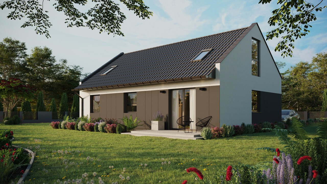 Projekt ERDOL 3 w wybranej konfiguracji posiada dach dwuspadowy nowoczesny z poddaszem użytkowym o kącie nachylenia 35 stopni oraz wyposażony jest w stolarkę PVC firmy EUROCOLOR SYNEGO na profilu marki REHAU o szerokości 80mm w kolorze antracytowym.