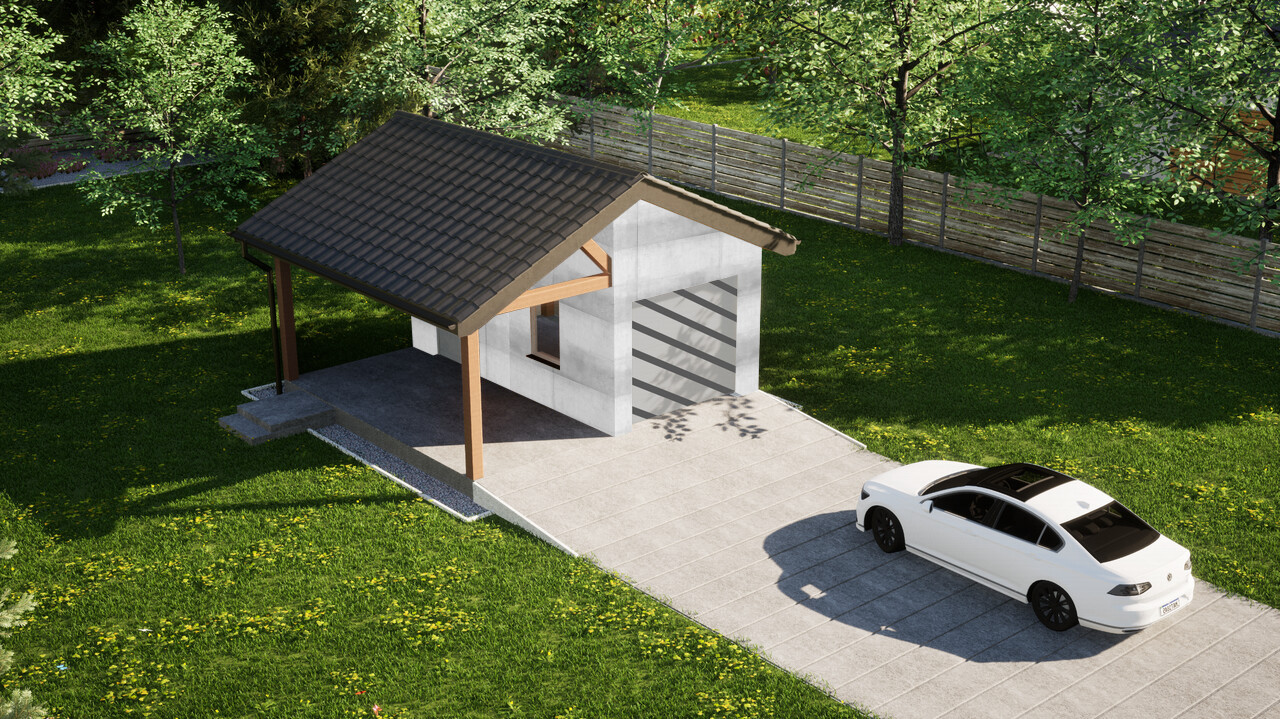 Garaż jednostanowiskowy z dodatkową wiatą ERDOL G1W to połączenie zamkniętego garażu o powierzchni 15,5 m² oraz wiaty z dachem o wymiarach 2,5 m na 5,9 m. Jest to układ, który pozwoli na wygodne przechowywanie jednego samochodu wewnątrz budynku, a jednego pod osłoną dachu.