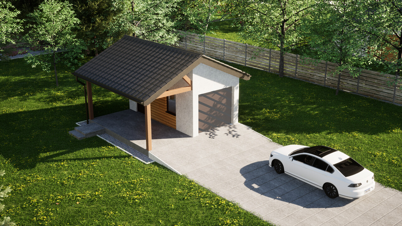 Garaż jednostanowiskowy z dodatkową wiatą ERDOL G1W to połączenie zamkniętego garażu o powierzchni 15,5 m² oraz wiaty z dachem o wymiarach 2,5 m na 5,9 m. Jest to układ, który pozwoli na wygodne przechowywanie jednego samochodu wewnątrz budynku, a jednego pod osłoną dachu.