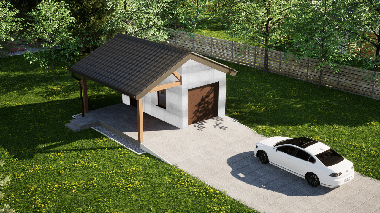 Garaż jednostanowiskowy z dodatkową wiatą ERDOL G1W to połączenie zamkniętego garażu o powierzchni 15,5 m² oraz wiaty z dachem o wymiarach 2,5 m na 5,9 m. Jest to układ, który pozwoli na wygodne przechowywanie jednego samochodu wewnątrz budynku, a jednego pod osłoną dachu.