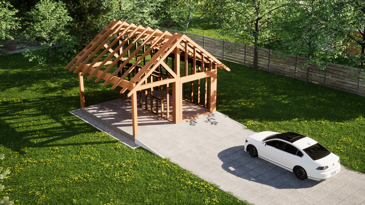 Konstrukcja garażu stworzona jest z tego samego drewna, co konstrukcja domów ERDOL HAUS, czyli z niezwykle wytrzymałego drewna KVH. Ściany garażu są wykończone i docieplone od strony zewnętrznej, a od strony wewnętrznej widoczny jest szkielet budynku.