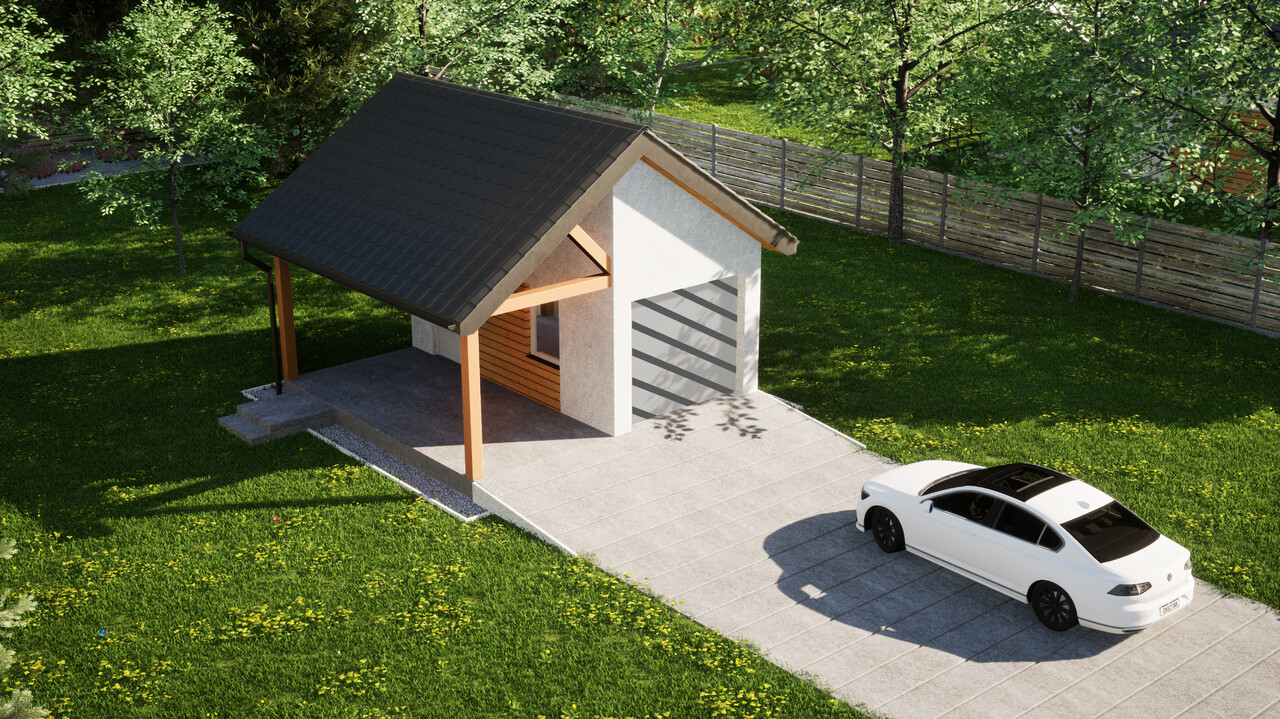 Garaż jednostanowiskowy z dodatkową wiatą ERDOL G1W to połączenie zamkniętego garażu o powierzchni 15,5 m² oraz wiaty z dachem o wymiarach 2,5 m na 5,9 m. Jest to układ, który pozwoli na wygodne przechowywanie jednego samochodu wewnątrz budynku, a jednego pod osłoną dachu.