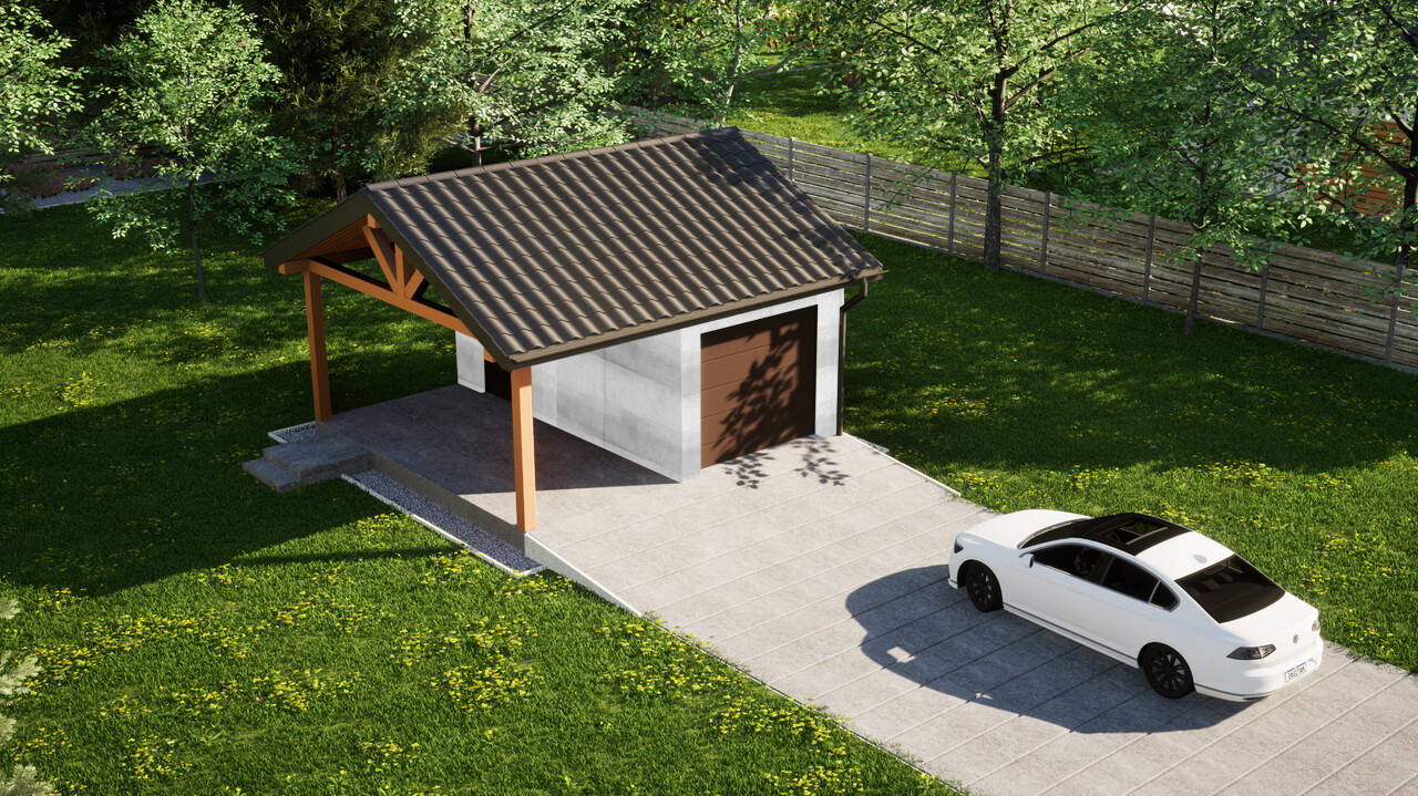 Garaż jednostanowiskowy z dodatkową wiatą ERDOL G1W to połączenie zamkniętego garażu o powierzchni 15,5 m² oraz wiaty z dachem o wymiarach 2,5 m na 5,9 m. Jest to układ, który pozwoli na wygodne przechowywanie jednego samochodu wewnątrz budynku, a jednego pod osłoną dachu.
