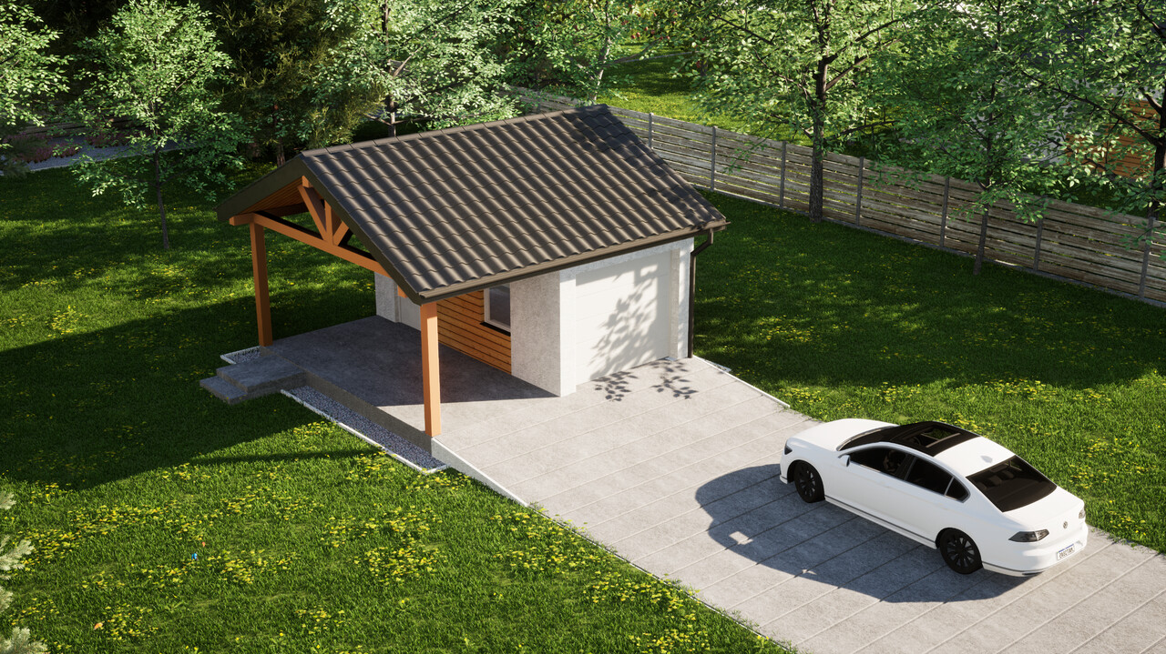 Garaż jednostanowiskowy z dodatkową wiatą ERDOL G1W to połączenie zamkniętego garażu o powierzchni 15,5 m² oraz wiaty z dachem o wymiarach 2,5 m na 5,9 m. Jest to układ, który pozwoli na wygodne przechowywanie jednego samochodu wewnątrz budynku, a jednego pod osłoną dachu.