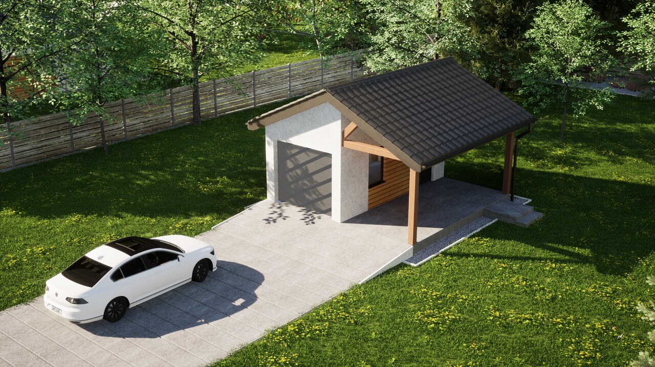 Garaż jednostanowiskowy z dodatkową wiatą ERDOL G1W to połączenie zamkniętego garażu o powierzchni 15,5 m² oraz wiaty z dachem o wymiarach 2,5 m na 5,9 m. Jest to układ, który pozwoli na wygodne przechowywanie jednego samochodu wewnątrz budynku, a jednego pod osłoną dachu.