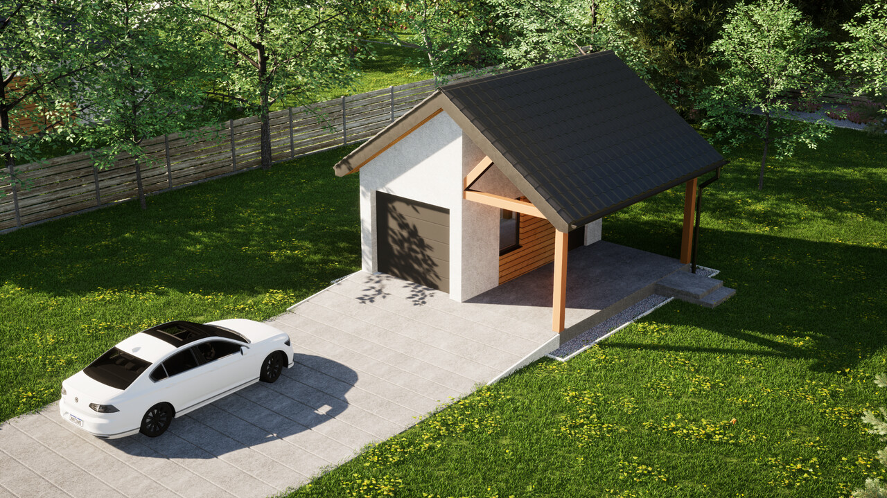 Garaż jednostanowiskowy z dodatkową wiatą ERDOL G1W to połączenie zamkniętego garażu o powierzchni 15,5 m² oraz wiaty z dachem o wymiarach 2,5 m na 5,9 m. Jest to układ, który pozwoli na wygodne przechowywanie jednego samochodu wewnątrz budynku, a jednego pod osłoną dachu.