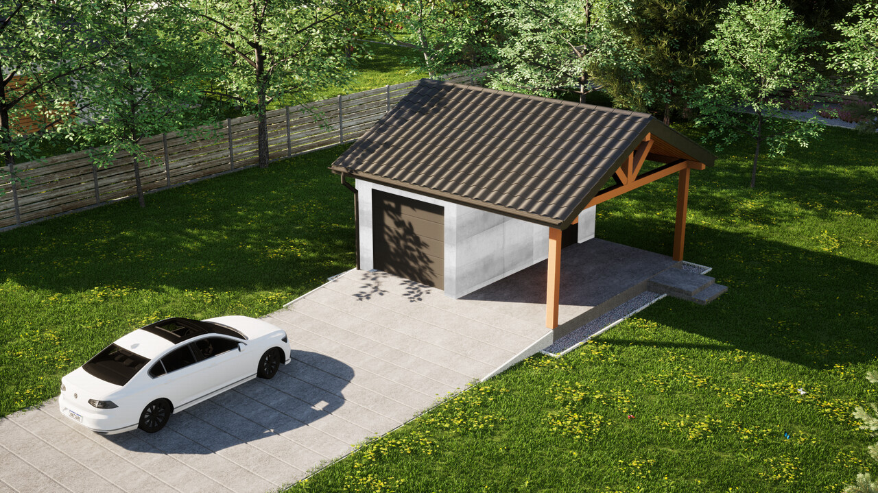 Garaż jednostanowiskowy z dodatkową wiatą ERDOL G1W to połączenie zamkniętego garażu o powierzchni 15,5 m² oraz wiaty z dachem o wymiarach 2,5 m na 5,9 m. Jest to układ, który pozwoli na wygodne przechowywanie jednego samochodu wewnątrz budynku, a jednego pod osłoną dachu.
