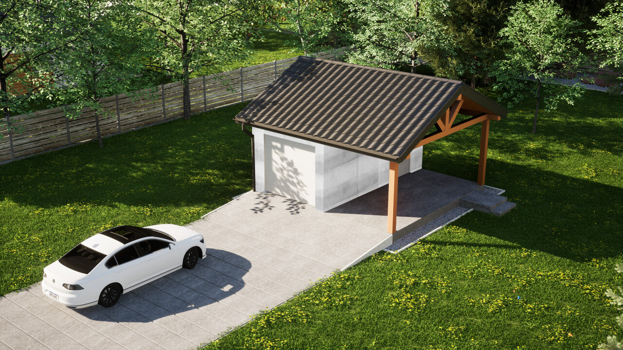 Garaż jednostanowiskowy z dodatkową wiatą ERDOL G1W to połączenie zamkniętego garażu o powierzchni 15,5 m² oraz wiaty z dachem o wymiarach 2,5 m na 5,9 m. Jest to układ, który pozwoli na wygodne przechowywanie jednego samochodu wewnątrz budynku, a jednego pod osłoną dachu.