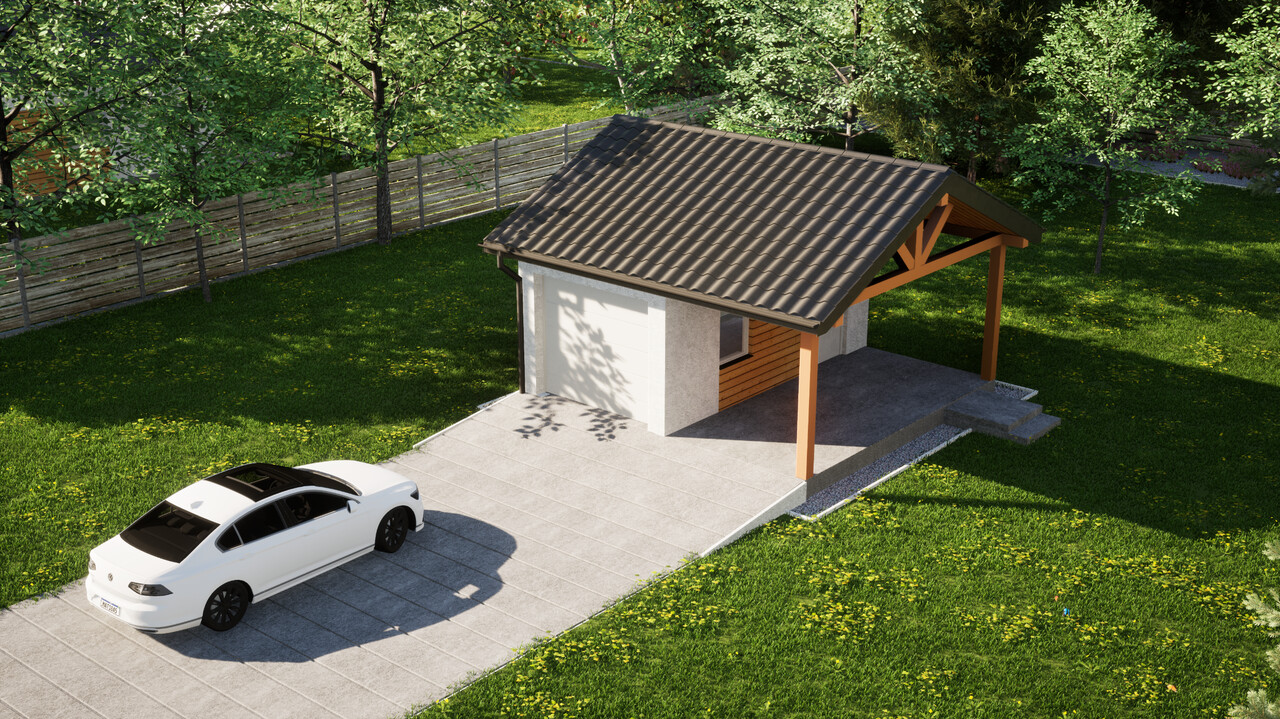 Garaż jednostanowiskowy z dodatkową wiatą ERDOL G1W to połączenie zamkniętego garażu o powierzchni 15,5 m² oraz wiaty z dachem o wymiarach 2,5 m na 5,9 m. Jest to układ, który pozwoli na wygodne przechowywanie jednego samochodu wewnątrz budynku, a jednego pod osłoną dachu.
