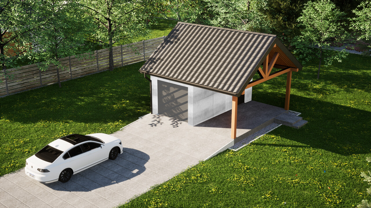 Garaż jednostanowiskowy z dodatkową wiatą ERDOL G1W to połączenie zamkniętego garażu o powierzchni 15,5 m² oraz wiaty z dachem o wymiarach 2,5 m na 5,9 m. Jest to układ, który pozwoli na wygodne przechowywanie jednego samochodu wewnątrz budynku, a jednego pod osłoną dachu.