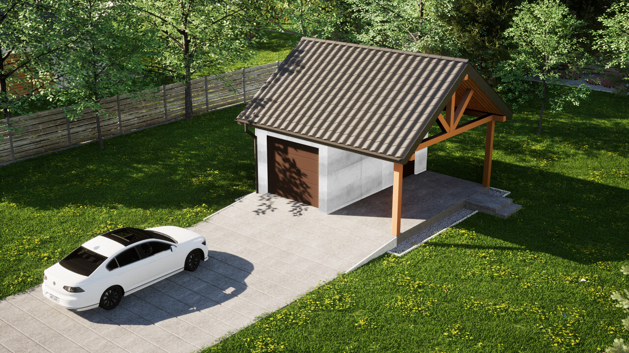 Garaż jednostanowiskowy z dodatkową wiatą ERDOL G1W to połączenie zamkniętego garażu o powierzchni 15,5 m² oraz wiaty z dachem o wymiarach 2,5 m na 5,9 m. Jest to układ, który pozwoli na wygodne przechowywanie jednego samochodu wewnątrz budynku, a jednego pod osłoną dachu.