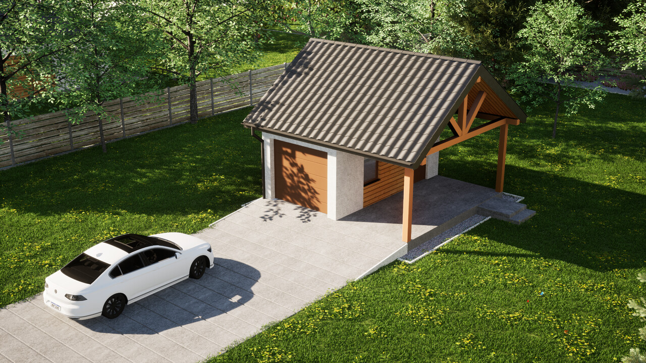 Garaż jednostanowiskowy z dodatkową wiatą ERDOL G1W to połączenie zamkniętego garażu o powierzchni 15,5 m² oraz wiaty z dachem o wymiarach 2,5 m na 5,9 m. Jest to układ, który pozwoli na wygodne przechowywanie jednego samochodu wewnątrz budynku, a jednego pod osłoną dachu.