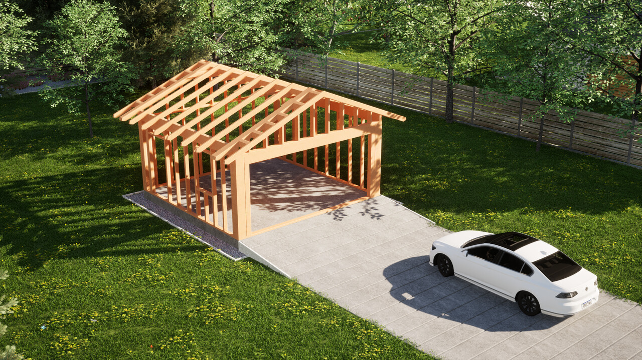 Konstrukcja garażu stworzona jest z tego samego drewna, co konstrukcja domów ERDOL HAUS, czyli z niezwykle wytrzymałego drewna KVH. Ściany garażu są wykończone i docieplone od strony zewnętrznej, a od strony wewnętrznej widoczny jest szkielet budynku.
