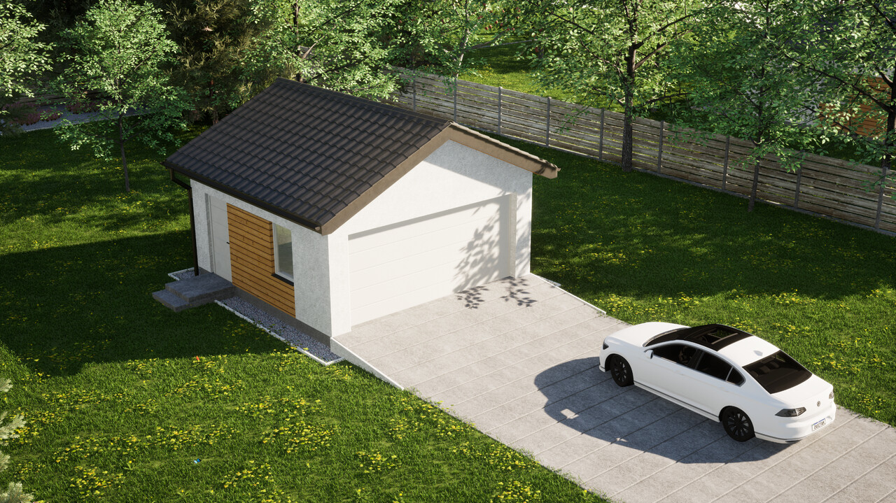 Konstrukcja garażu stworzona jest z tego samego drewna, co konstrukcja domów ERDOL HAUS, czyli z niezwykle wytrzymałego drewna KVH. Ściany garażu są wykończone i docieplone od strony zewnętrznej, a od strony wewnętrznej widoczny jest szkielet budynku.