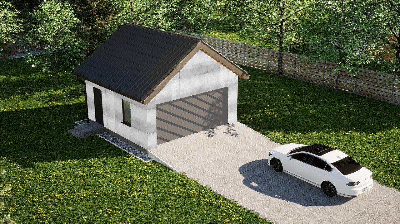Garaż ERDOL G2 w wybranej konfiguracji posiada układ kalenicy prostopadły z dachem dwuspadowym o kącie nachylenia 35 stopni oraz wyposażony jest w stolarkę PVC KÖMMERLING/EUROCOLOR SYNEGO/VEKA w kolorze antracytowym.