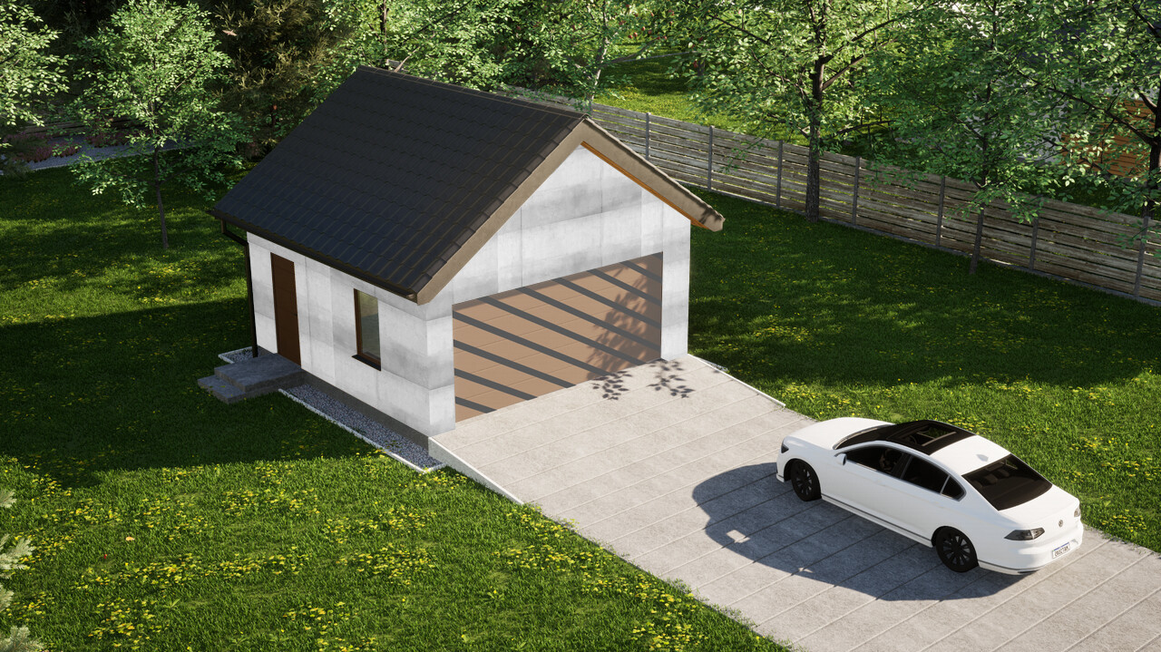 Garaż ERDOL G2 w wybranej konfiguracji posiada układ kalenicy prostopadły z dachem dwuspadowym o kącie nachylenia 35 stopni oraz wyposażony jest w stolarkę PVC KÖMMERLING/EUROCOLOR SYNEGO/VEKA w kolorze zloty dąb.