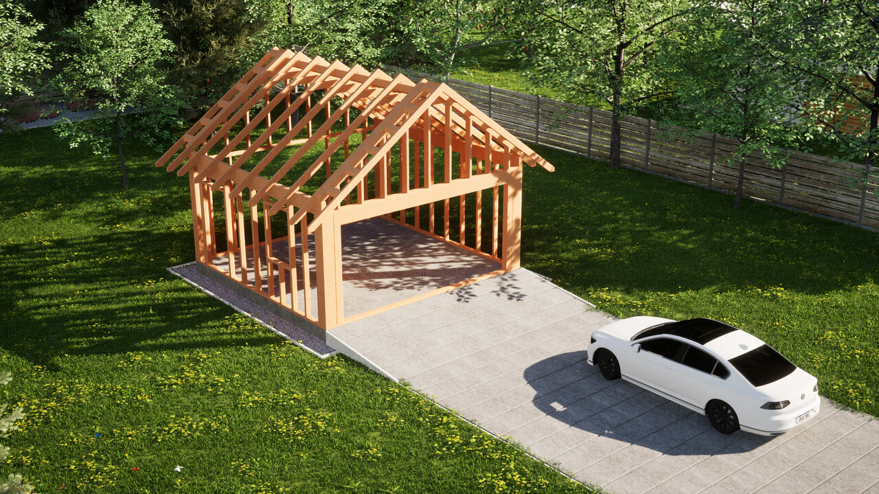 Konstrukcja garażu stworzona jest z tego samego drewna, co konstrukcja domów ERDOL HAUS, czyli z niezwykle wytrzymałego drewna KVH. Ściany garażu są wykończone i docieplone od strony zewnętrznej, a od strony wewnętrznej widoczny jest szkielet budynku.