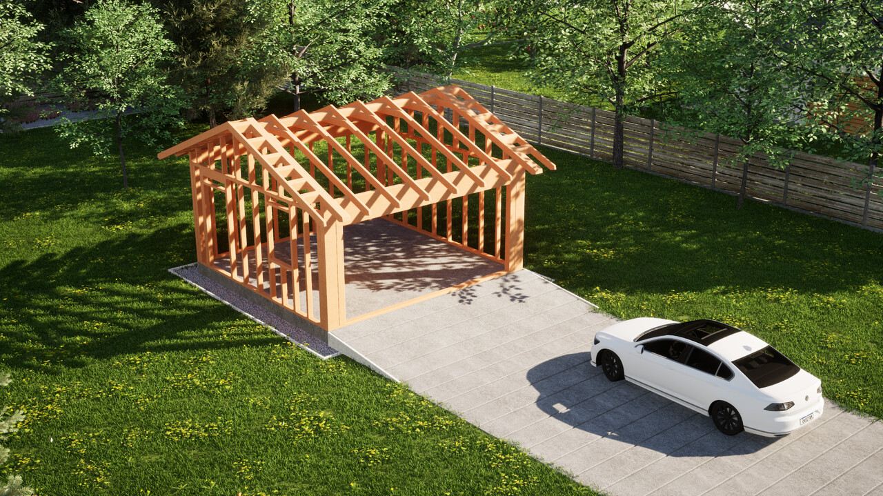 Konstrukcja garażu stworzona jest z tego samego drewna, co konstrukcja domów ERDOL HAUS, czyli z niezwykle wytrzymałego drewna KVH. Ściany garażu są wykończone i docieplone od strony zewnętrznej, a od strony wewnętrznej widoczny jest szkielet budynku.