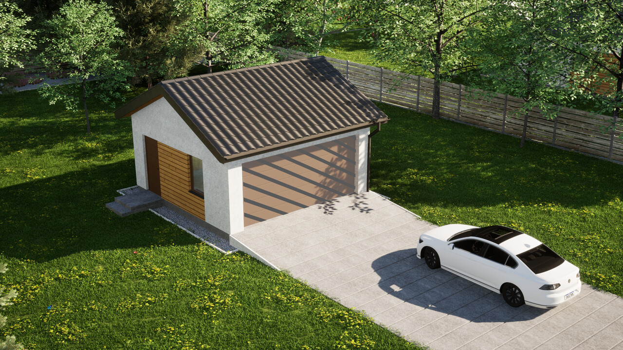 Garaż ERDOL G2 w wybranej konfiguracji posiada układ kalenicy równoległy z dachem dwuspadowym o kącie nachylenia 25 stopni oraz wyposażony jest w stolarkę PVC KÖMMERLING/EUROCOLOR SYNEGO/VEKA w kolorze zloty dąb.