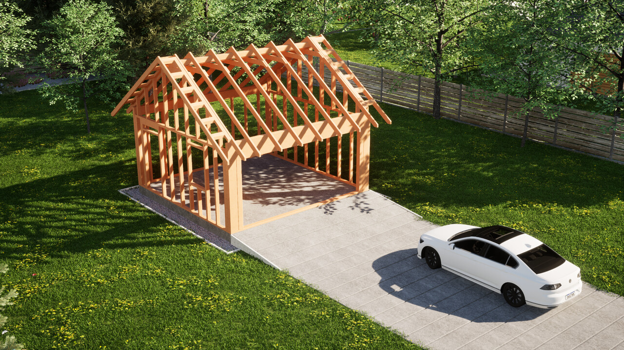 Konstrukcja garażu stworzona jest z tego samego drewna, co konstrukcja domów ERDOL HAUS, czyli z niezwykle wytrzymałego drewna KVH. Ściany garażu są wykończone i docieplone od strony zewnętrznej, a od strony wewnętrznej widoczny jest szkielet budynku.