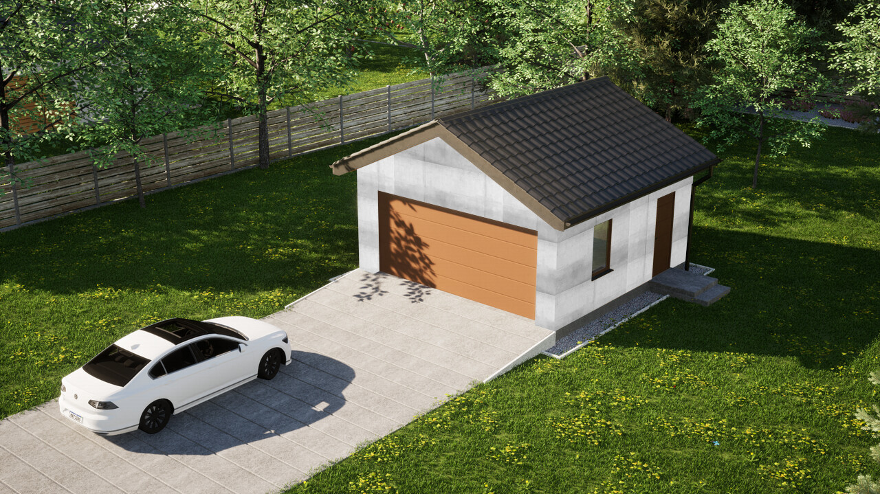 Garaż ERDOL G2 w wybranej konfiguracji posiada układ kalenicy prostopadły z dachem dwuspadowym o kącie nachylenia 25 stopni, wyposażony jest w stolarkę PVC KÖMMERLING/EUROCOLOR SYNEGO/VEKA w kolorze zloty dąb oraz bramę segmentową UniPro firmy WIŚNIOWSKI z napędem IO oraz sterowaniem pilotem.
