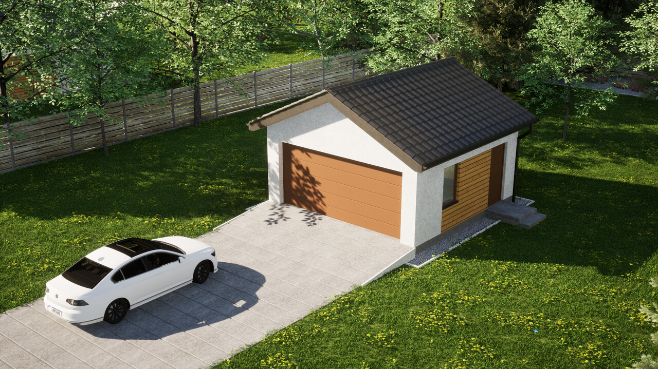 Garaż ERDOL G2 w wybranej konfiguracji posiada układ kalenicy prostopadły z dachem dwuspadowym o kącie nachylenia 25 stopni, wyposażony jest w stolarkę PVC KÖMMERLING/EUROCOLOR SYNEGO/VEKA w kolorze zloty dąb oraz bramę segmentową UniPro firmy WIŚNIOWSKI z napędem IO oraz sterowaniem pilotem.