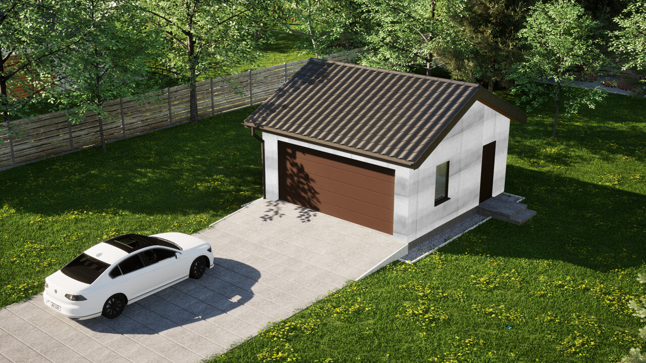 Garaż ERDOL G2 w wybranej konfiguracji posiada układ kalenicy równoległy z dachem dwuspadowym o kącie nachylenia 25 stopni, wyposażony jest w stolarkę PVC KÖMMERLING/EUROCOLOR SYNEGO/VEKA w kolorze orzech oraz bramę segmentową UniPro firmy WIŚNIOWSKI z napędem IO oraz sterowaniem pilotem.